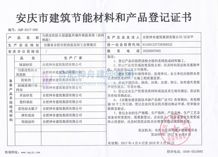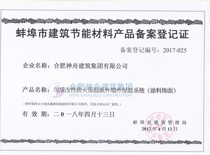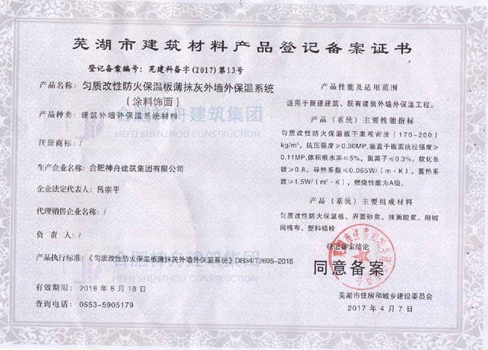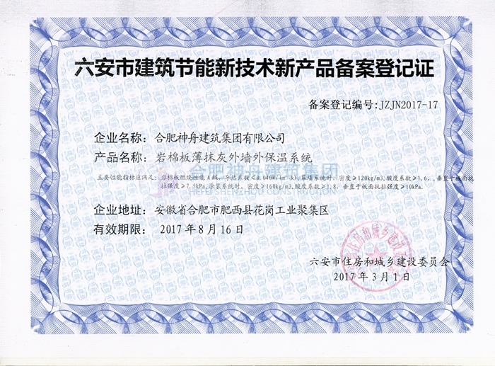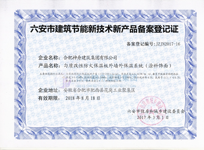 截止2017年5月10日,神舟集团完成了安徽省六安市、芜湖市、滁州市、蚌埠市、安庆市、淮北市等多个市区的匀质板保温系统的备案